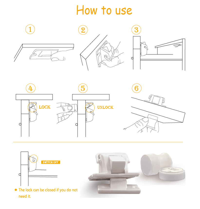 2.在柜子上或直角上,防止儿童弄乱柜子里的物品。也可用于药盒,以阻止儿童吃药,以避免事故